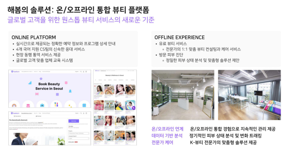 “그간의 과정을 종합하면 해봄은 고객의 니즈를 따라 진화하는 회사라고 할 수 있어요. 초반에는 K-뷰티를 향한 한국 여행객들의 관심에 집중해 뷰티 서비스 중개와 통역 기반 비즈니스 모델을 만들었고 그들의 니즈를 파악해가며 직접 서비스를 제공하는 해봄 스튜디오를 오픈했죠. 이 새로운 솔루션도 마찬가지예요. 스튜디오 오픈 후 꾸준히 고객 인터뷰를 진행했고 한국에 오는 사람들을 외에 올 수 없는 사람들 또한 ‘K-뷰티’의 코어를 경험할 수 있도록 하자는 목표로 기획이 됐죠.”