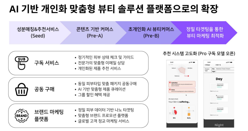 “해봄이 가지고 있는 가장 큰 무기는 데이터라고 생각해요. 글로벌 고객들이 현재 어떤 제품을 사용하고 있는지부터, 어떤 피부 상태인지, 어떤 니즈를 가지고 있는지 등의 데이터를 꾸준히 확보할 계획이예요. 초기 MVP(최소기능제품)의 경우 저희 솔루션 내에서 고객이 피부 타입을 진단 받으면 그 피부 타입을 기반으로 고객이 궁금해 하는 제품의 적합도가 어느 정도인지를 알려줘요. . 때론 그 보다 더 적합한 제품을 추천하기도 하죠. 다음 단계로는 고객이 스킨케어 루틴을 설계하도록 도와요. 보통 스킨 케어 제품은 하나만 쓰지 않으니까요.”