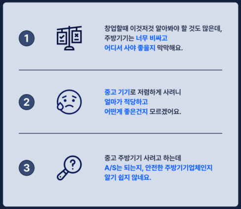 이야기를 듣다 보니 언뜻 여느 중고 거래 플랫폼과 유사한 비즈니스 모델이라는 생각이 들었다. 배 대표 역시 어느 정도 유사성을 인정하면서도 한편으로 “요식업에 초점을 맞춘 헤이딜러 모델에 가깝다’는 입장을 밝혔다. 그러면서 배 대표는 ‘정보 비대칭 해소’ ‘편리성’ ‘타이밍’이라는 세 가지 가치와 함께 창업과 폐업이 맞물린 이 시장에서 중요한 ‘속도’를 강조했다.