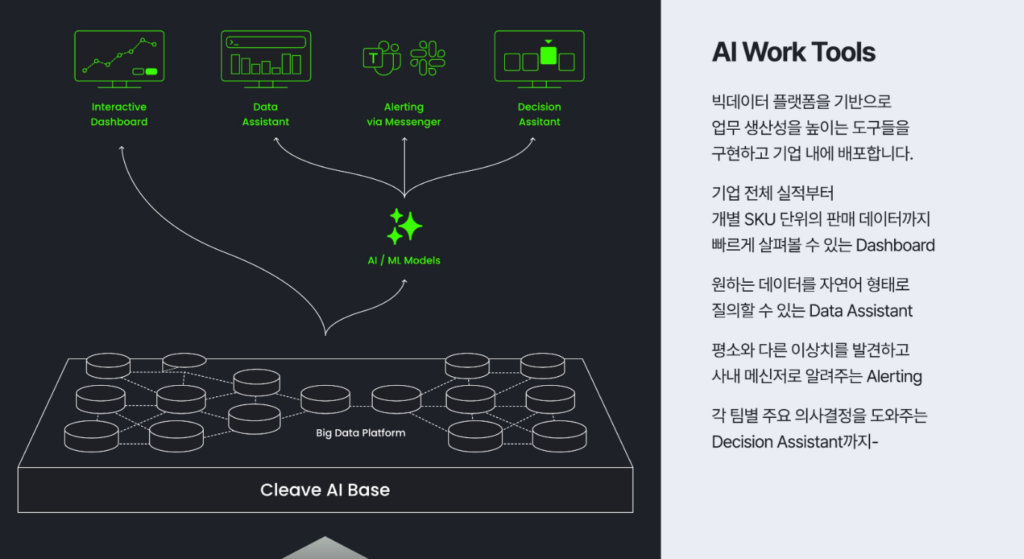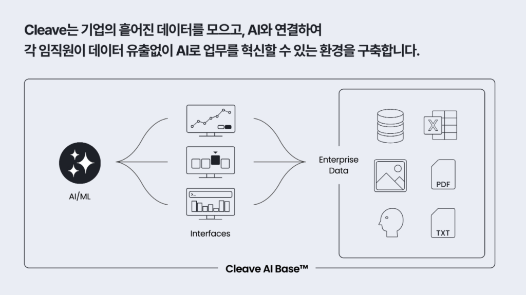 "클리브는 특정 제품 하나라기보다는 저희 회사가 제공하는 서비스의 이름입니다. 과거에는 저희도 기업에 흩어져 있는 데이터를 한 데 모으기 위한 도구들을 만들기도 했어요. 하지만현재는 내외부 데이터를 활용해서 AI를 기업의 변화를 위해 제대로 쓸 수 있도록 돕는 것에 집중하고 있습니다. AI 모델이 빠르게 발전하는 중에 더 이상 특정 AI 모델을 제공하는 서비스는 현실적이지 않습니다. 오히려 새로운 도구들을 고객사가 잘 활용할 수 있게 도와주는 것이 중요하죠.”