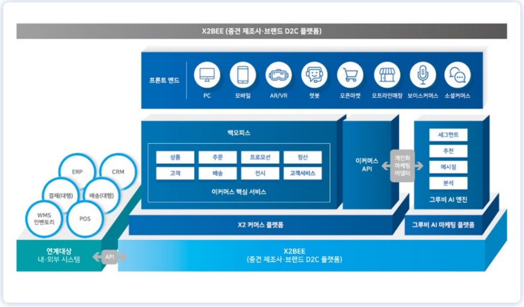 이에 따라 국내에서도 헤드리스 커머스 기술을 제공하는 회사들이 등장하기 시작하였는데, 플래티어의 ‘엑스투비(X2BEE)’가 대표적이다. 엑스투비는 헤드리스 커머스 기술을 적용한 D2C 플랫폼 솔루션으로, 모바일/PC/라이브커머스/메타버스 등 다양한 멀티 프론트 채널에 신속히 대응하는 등 높은 확장성을 자랑한다. 더불어 앞서 언급한 그루비와 연동하여, 데이터 기반으로 고객 세그먼트에 따라 마케팅을 할 수 있다는 것도 특장점이다.