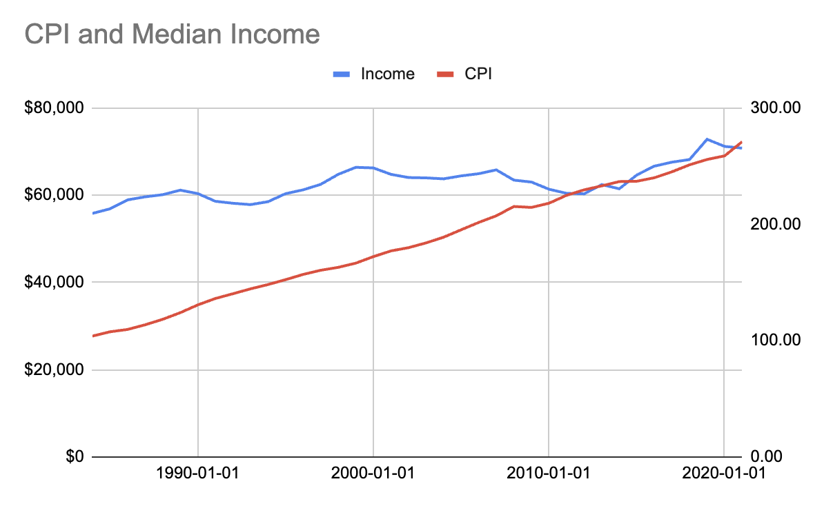 사실 부동산뿐만 아니라 소비자 물가 전체에서도 같은 일이 일어나고 있습니다. 아래 차트는 CPI(소비자물가지수)와 소득의 중앙값을 나타내고 있는데요, CPI도 같은 기간 160%나 상승하였습니다. 부동산도 소비자물가지수도 소득 수준보다 훨씬 빨리 상승한 것입니다.