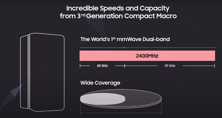 '3세대 듀얼밴드 컴팩트 매크로 기지국'은 업계 최초로 2개의 초고주파대역을 동시에 지원한다. 2천400MHz의 대역폭을 지원하는 것이 특징인데, 이는 현재까지 공개된 제품 중 최대다. 이동통신사 별 최대 할당된 초고주파 대역폭이 800MHz라는 것을 감안했을 때 향후 주파수 경매를 통해 확보하는 초고주파 대역에 따라 더 빠른 5G 속도를 실현할 수 있다.
