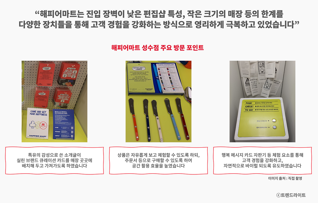 지금까지 해피어마트 성수점을 고객 경험 설계 측면에서 살펴보았는데요. 확실히 참고할 점이 많은 곳인 동시에, 위치 또한 요즘 가장 핫한 트렌드를 엿볼 수 있는 연무장길 초입에 있는 만큼, 성수에 가신다면 한 번쯤 들려보시는 것도 좋을 것 같습니다.
