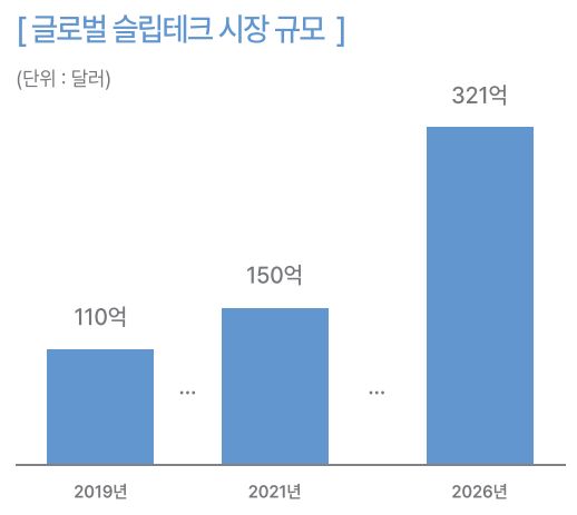 기술로 수면문제를 해결하려는 슬립테크 시장 규모는 가파르게 성장할 전망이다. 시장조사 기업 글로벌마켓인사이트(Global Market Insights)에 따르면, 글로벌 슬립테크 시장 규모는 2021년 150억 달러(약 20조원)에서 2026년 321억 달러(약 45조원)까지 성장할 것으로 예측된다.