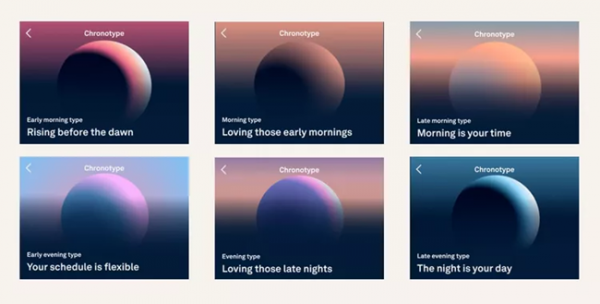 흥미로운 특징 중 하나는 사용자의 생체시계를 진단하는 것인데, 90일 간의 데이터가 쌓이면 종달새형과 올빼미형을 포함해 총 6가지 크로노타입 중 무엇에 해당하는지 알 수 있다. 타입에 따라 최적의 기상 및 수면시간을 추천해주고 어떻게 조정해야 할지 지침을 안내한다.
