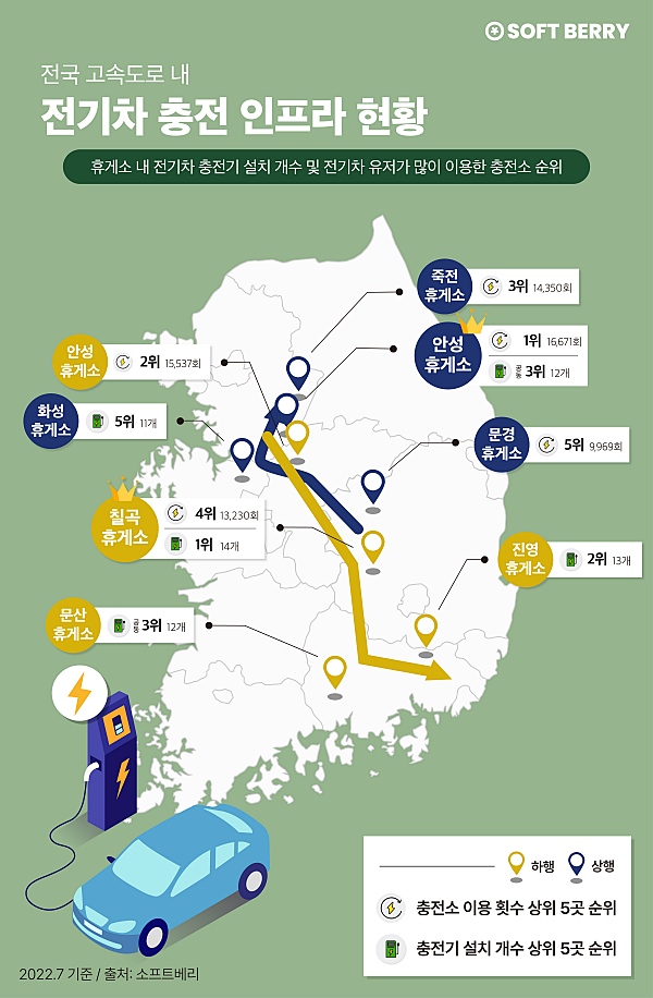소프트베리에 따르면, 전기차 충전기는 경부고속도로 칠곡휴게소 부산방향이 14개로 가장 많았고 뒤이어 남해고속도로 진영휴게소 순천방향 13개, 경부고속도로 안성휴게소 서울방향 12개, 남해고속도로 문산휴게소 순천방향 12개, 서해안고속도로 화성휴게소 시흥방향 11개로 나타났다.