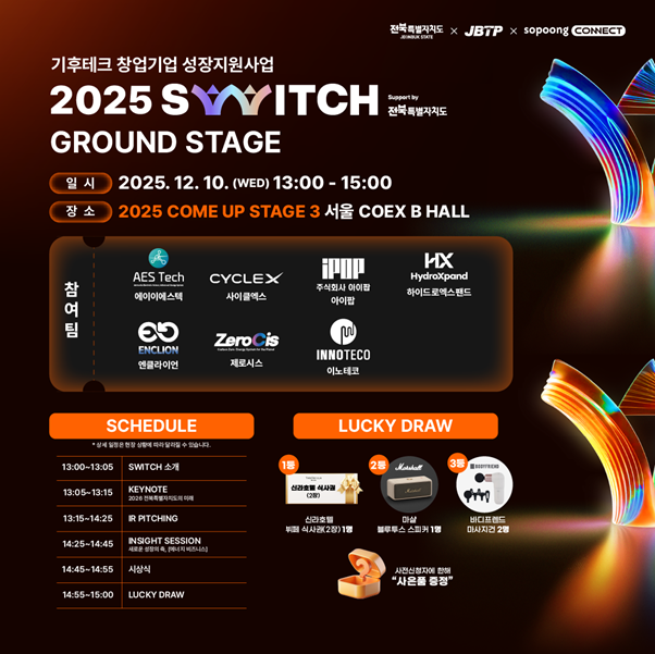 한편 ‘2025 SWITCH: Ground Stage(신규트랙)’ 데모데이는 12월 10일 13시, 코엑스 B홀 Stage 3에서 진행된다. 컴업 2025 프로그램명은 ‘새 시대, 새 지평, 전북특별자치도’이다. 올해 데모데이 발표 기업들에게는 총 2,000만 원 규모의 상금을 수여한다. SWITCH 프로그램은 참여기업의 성장단계에 따라 ‘성장트랙(Growth Stage)’과 ‘신규트랙(Ground Stage)’으로 세분화해 ▲PoC(Proof of Concept, 실증) ▲투자 유치 ▲B2B 세일즈 ▲R&D 컨소시엄 등을 제공하고 있어 호평을 받고 있다.