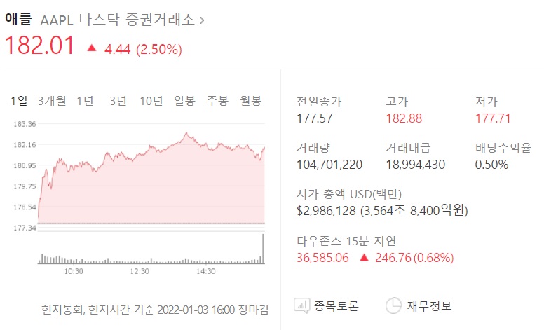 애플의 주가는 182.88달러까지 올라 역대 최고점을 기록했고, 전 거래일 대비 2.50% 상승한 182.01달러로 장을 마감했다.