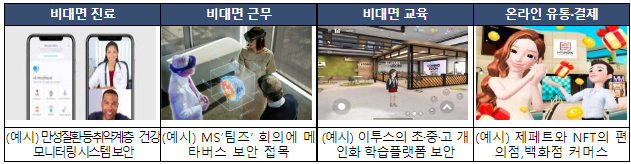 코로나 원격의료 지원 서비스와 메타버스(3차원 가상세계) 서비스를 위한 보안모델을 개발하고, '안심스마트점포' 모델을 확산하는 등 비대면 서비스를 겨냥한 보안 위협 대응을 강화한다는 방침이다.