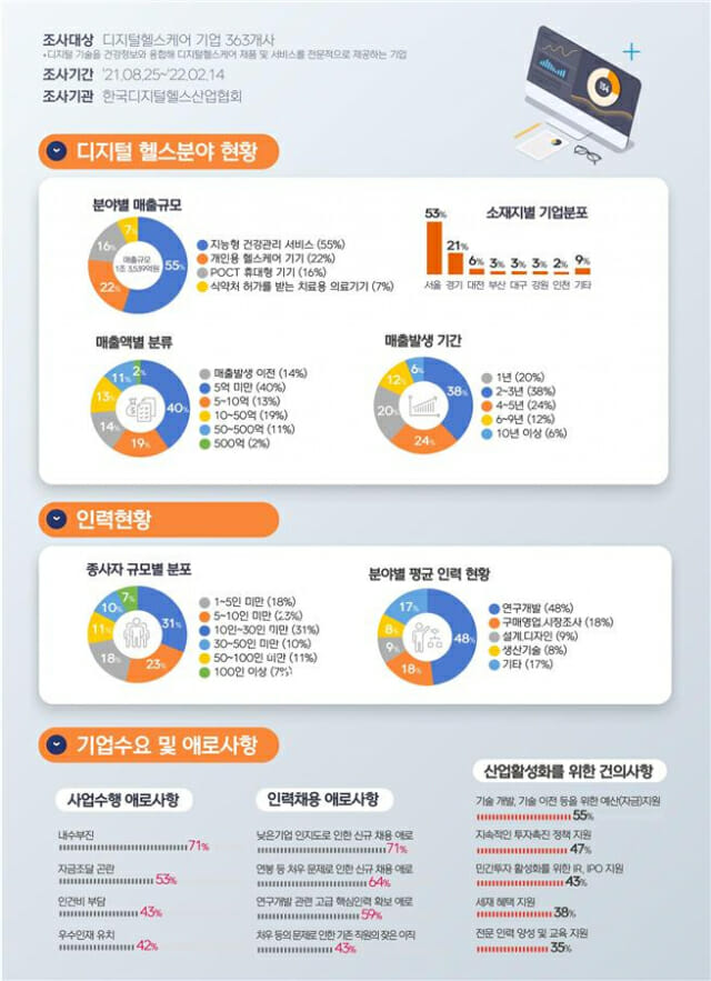 이 분야의 육성이 필수적인 이유는 아직까지 소규모 신생 기업 중심으로 시장이 형성되고 있기 때문이다. 산업통상자원부가 디지털 헬스케어 서비스·기기 분야 363곳의 기업을 분석한 자료에 따르면 이중 매출 5억원 미만 기업이 194개사로 절반 이상을 차지하고 있다.