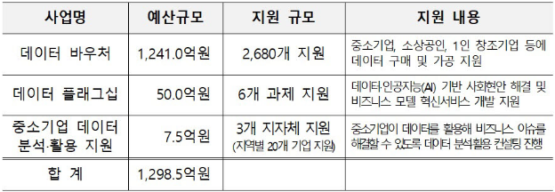 이에 2019년부터 추진해온 데이터 바우처 사업에 총 1300억원을 투입한다. 총 예산 1241억원, 데이터 플래그십 50억원, 중소기업 데이터 분석·활용 지원에는 7억5000억원을 지원한다. 여러 분야에서 모인 데이터를 활용해 국민이 체감할 수 있는 혁신적 성과 창출을 지원하기 위함이다.