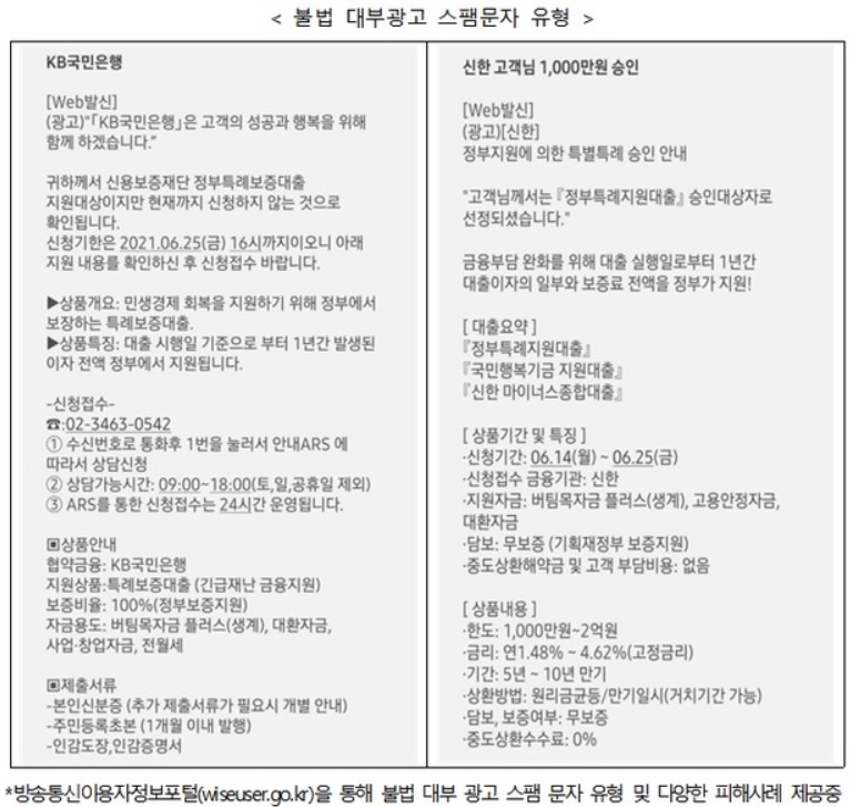 휴대폰 문자로 OO은행에서 정부가 지원하는 대출이라는 내용이 담긴 문자를 받는다면, 이는 99.9% 불법 대부 광고 스팸 문자라는 생각을 해 봐야 한다. 최근에 어려운 서민들의 경제 사정과 영끌 투자를 위한 대출이 급증하고 있어 더욱 주의가 필요하다.