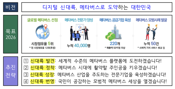 정부가 2026년까지 ‘메타버스 세계 시장 점유율 5위 달성’을 목표로 생활, 관광, 문화예술 등 분야별 메타버스 플랫폼 발굴을 대대적으로 지원한다고 밝혔다.
