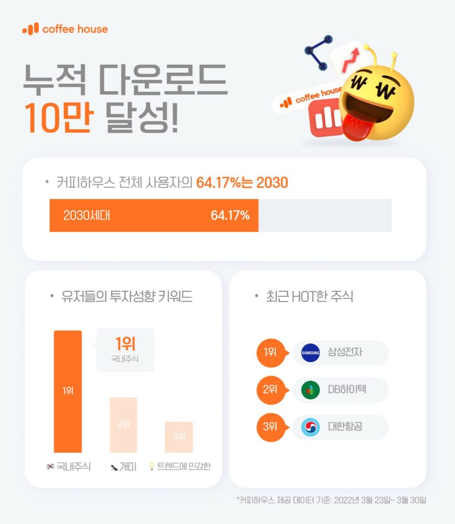 스타트업 소셜인베스팅랩은 자사의 소셜 인베스팅 플랫폼 ‘커피하우스’ 앱이 출시된 지 3개월 만에 누적 다운로드 수 10만건을 돌파했다고 31일 밝혔다.