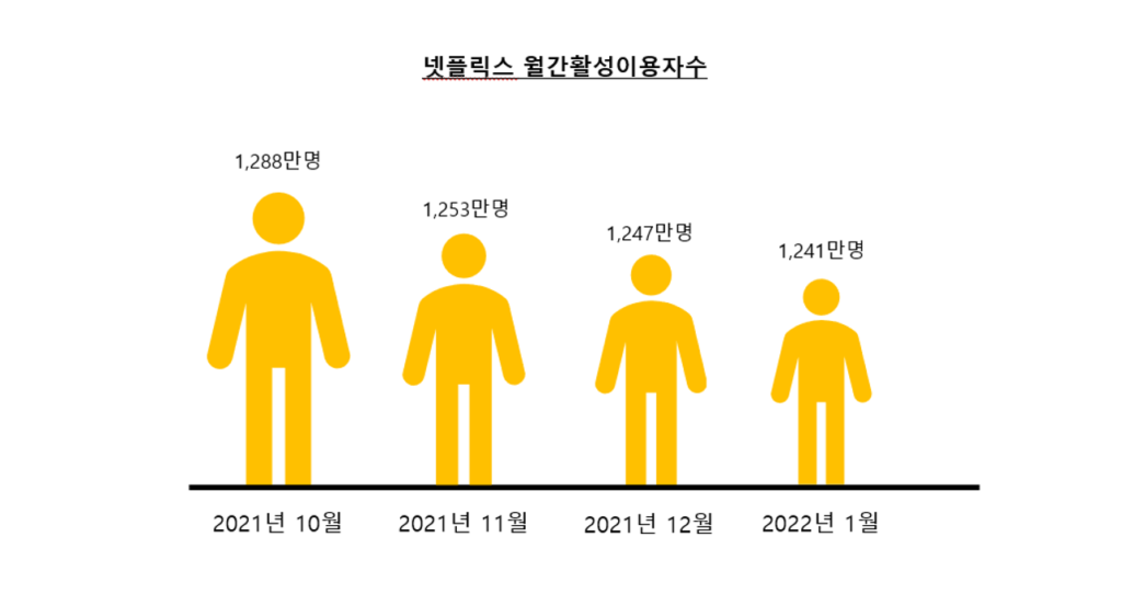 지난 1월 넷플릭스의 월간활성이용자(MAU)는 약 1241만 명으로 전월 대비 6만 7000명가량 줄었다. 요금 인상 발표 이후 유료결제자 수는 지난해 10월 1288만 명, 11월 1253만 명, 12월 1247만 명으로 계속 줄고 있다.