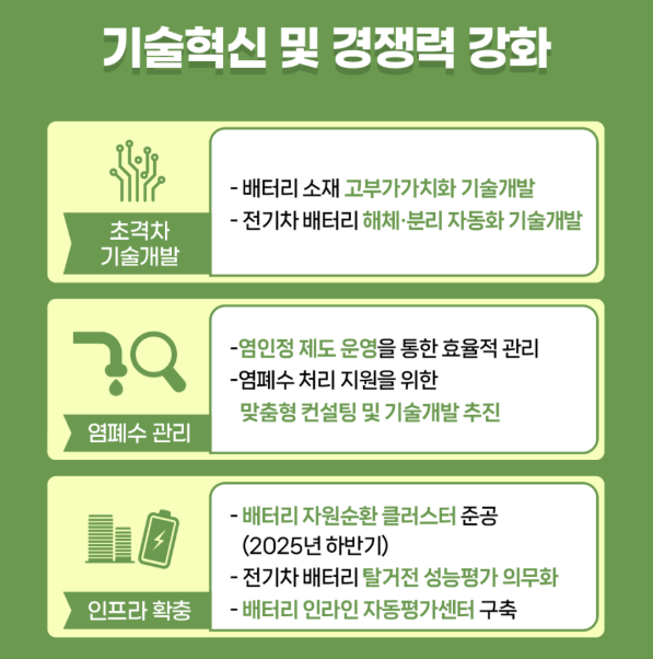 또한 올해 3월 정부가 발표한 '2025 공급망 안정화 시행계획'에 따르면 3년간 55조 원을 투입해 공급망 안정화를 추진한다. 이 중 핵심광물 분야에만 약 8조원이 배정됐다. 산업은행과 수출입은행은 '공급망 안정화 기금'을 조성해 기업들의 해외 광산 지분 투자, 장기 구매 계약, 재활용 시설 구축 등을 지원하고 있다. 중소기업에는 신용보증 확대와 이자 보전 프로그램이 제공된다.