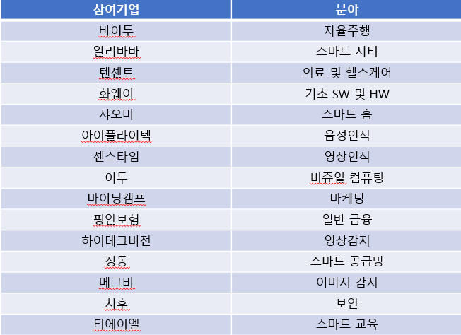 특히 이러한 정책 방향이 결정 된 이후 중국 정부는 특정 기업을 집중 육성해 자국 주도의 독자 AI 생태계를 구축하는데 공을 들였는데, 바로 ‘중국 AI 개발 혁신 플랫폼’이 그것이다. 여기에는 이른바 ‘BAT’로 불리는, 중국을 선도하는 3대 IT기업인 바이두, 알리바바, 텐센트를 비롯해 화웨이, 샤오미 등 세계적으로 이름을 알린 기업들이 다수 포함돼 있다.