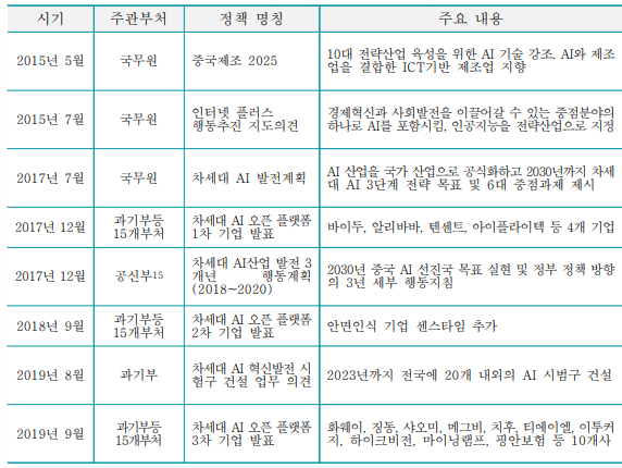 ‘차세대 인공지능 발전계획’ 발표 이후 중국 정부는 공업정보화부, 과학기술부, 교육부 등을 비롯한 정부 부처에서 산업 별 행동계획, 과학기술 혁신 체계 구축, 인공지능 분야 고급 인재 유치 및 육성 정책을 속도감 있게 추진해 왔다.