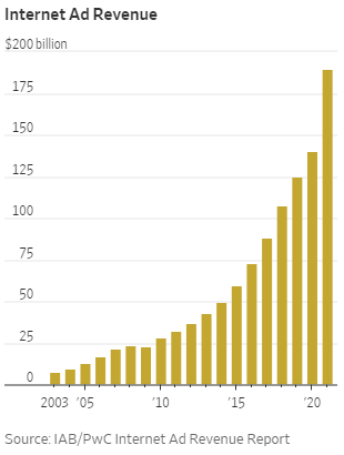 Digital ad revenue in the U.S. jumped 35% to $189 billion last year. The rise was well above the 12% growth rate of 2020. The year-over-year growth in 2021 was the highest the digital ad market had seen since 2006. A flood of new businesses contributed to the growth in digital ads.