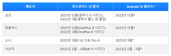 구글을 안드로이드 13을 개발하며 주요 휴대폰 제조사와 협력하고 있다. 삼성전자를 포함해 샤오미, 소니, 원플러스, 심지어 LG까지 다수의 제조사가 안드로이드 13을 지원할 예정이다. 그러나 제조사별로 최신 제품을 중심으로 안드로이드 13 업데이트를 제공할 것으로 보인다. 기본적으로 안드로이드 12가 적용돼 출시됐던 제품들은 안드로이드 13으로 무상 업데이트가 가능하다고 여기면 될 것이다.