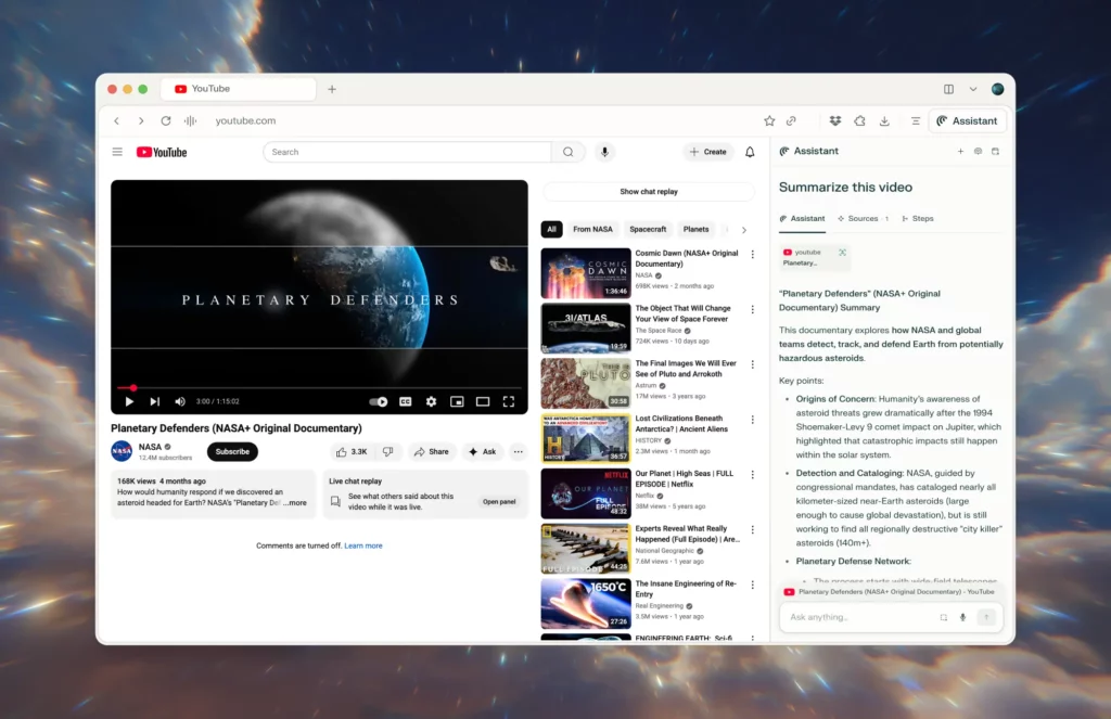 이 도구는 단순한 확장 프로그램이 아니라 탭, 북마크, 비공개 모드 등을 모두 갖춘 완전한 형태의 브라우저다. 사용자가 현재 보고 있는 페이지와 열려 있는 탭들, 그리고 웹 탐색 이력(활성화 시)을 모두 인식해 연구, 쇼핑, 업무 생산성 작업에서 더욱 정확하고 신속한 지원을 제공한다. 비공개로 웹을 둘러보거나 기록을 지우는 것도 가능하며, AI가 과거 페이지를 찾거나 중단된 작업을 이어서 하도록 돕는 '브라우저 메모리' 기능 역시 사용자 선택에 맡겨져 있다.