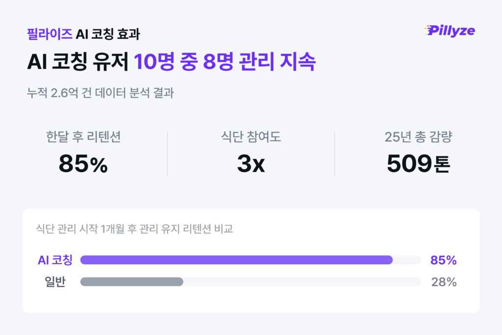 필라이즈에 따르면 일반적으로 이용자들은 주말에 식단 기록을 중단하는 경우가 많지만, AI 코칭을 활용하는 이용자들은 기록이 끊기더라도 다시 이어가는 경향을 보였다. 이러한 패턴은 이후 관리 지속 여부와 관련된 지표에서 차이를 보이는 것으로 나타났다.