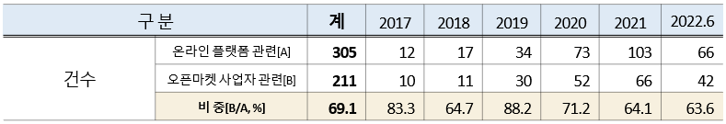 또한, 온라인 플랫폼 관련 분쟁 중 오픈마켓 사업자와 입점업체 사이 분쟁은 전체 접수의 69%를 차지하는 것으로 나타났다. 주요 사례는 판매 정지 조치, 판매 대금 지급 보류, 과도한 광고비 부과, 일방적인 소비자 환불 요청 수용 등이다.