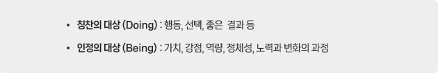 칭찬과 인정, 어느 것이 더 중요하다고 말할 순 없다. 다만 그동안 구성원의 긍정적인 행동만 칭찬했다면, 앞으로 구성원의 존재도 인정해줄 필요가 있다.