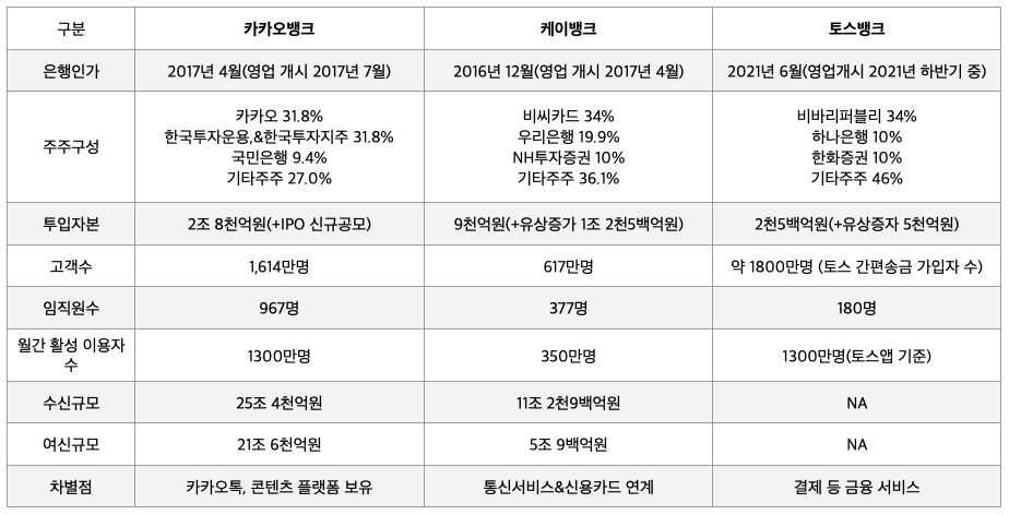 케이뱅크의 경우, KT의 대주주 적격성 심사 이슈로 멈칫했지만 최대주주 지위를 비씨카드에 넘겨줌으로써 지배구조 안정화를 통해 자본확충 여력을 만들어냈다. 유상증자를 완료했으며, 2021년 상반기 흑자 전환을 이루며 정상화 궤도에 올랐다. 게다가 가상화폐 거래소 계정 서비스로 2021년을 넘기며 117% 성장했다. 케이뱅크의 총자산 규모는 9조 4000억원이다.