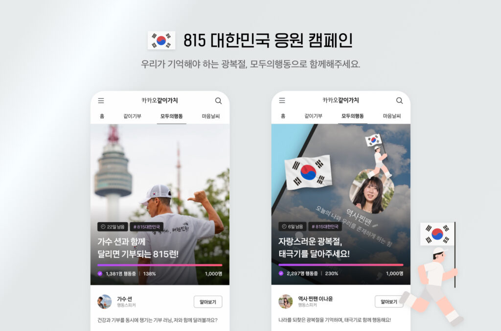 카카오의 사회공헌 플랫폼 ‘카카오같이가치’는 오는 15일 광복절을 앞두고 ‘815 대한민국 응원 캠페인’을 진행중이라고 11일 밝혔다. 행동 참여 프로젝트 ‘모두의행동’을 통해 캠페인에 참여해 인증하거나, 모금함을 통해 기부에 참여할 수 있다.