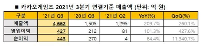 3일 카카오게임즈는 3분기 매출액 4662억원, 영업이익 427억원을 기록했다고 밝혔다. 전년 동기 대비 각각 210%, 101% 증가했다. 당기 순이익은 약 443억원으로 전년 동기 대비 64% 증가했다.