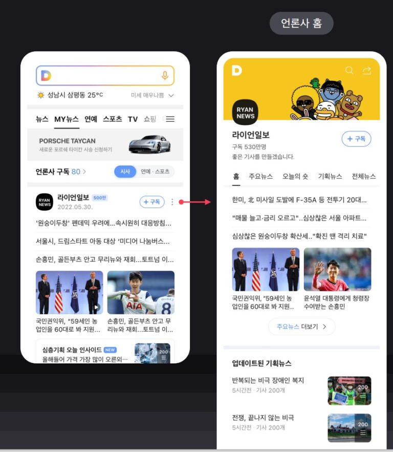 이용자는 마이뉴스탭에서 자신이 구독한 언론사 홈을 볼 수 있습니다.