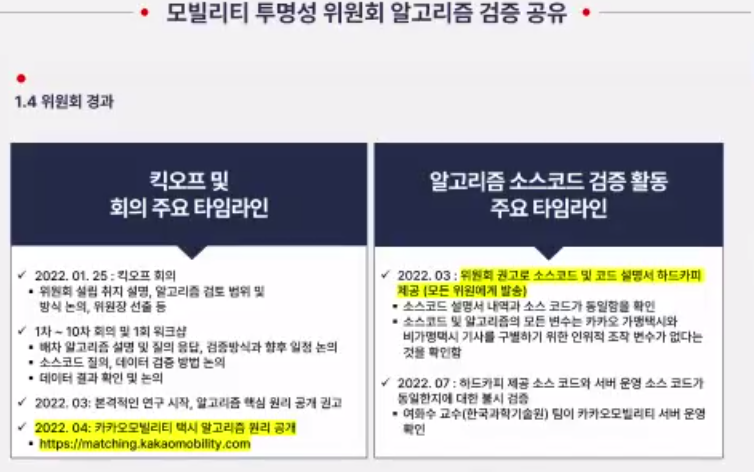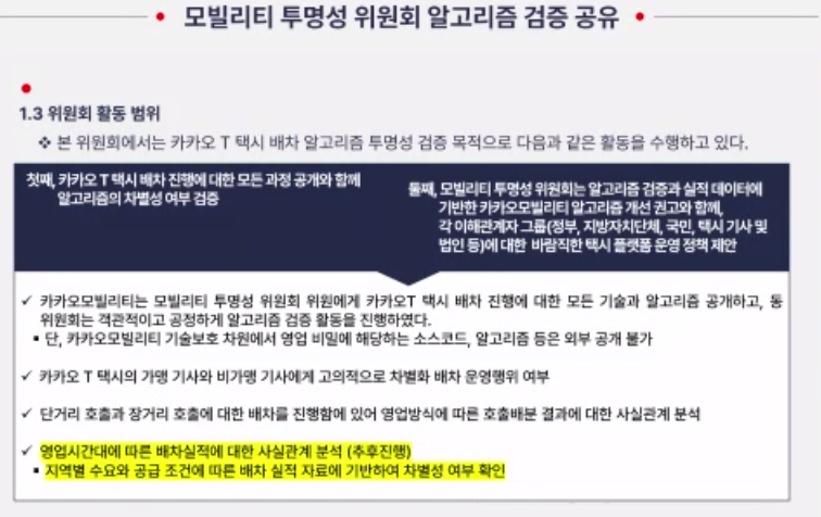 특히 위원회 측은 “이번 활동은 국내에서 택시 배차 시스템을 대상으로 이뤄진 첫 진단 및 연구로, 특히 외부 전문가 집단으로서는 이례적으로 기업의 알고리즘 소스코드 전반을 직접 확인했다는데 의의가 있다”며 “(위원회 위원들이) 카카오모빌리티를 불시 방문해 서비스가 구동되고 있는 실 운영서버 내의 소스코드를 확인하고, 17억 건에 달하는 택시 콜 발송 이력 데이터를 전수 분석하는 등 회사가 공개한 배차 알고리즘이 실제로 시스템에 반영돼 있는지를 면밀히 살펴봤다”고 강조했다.