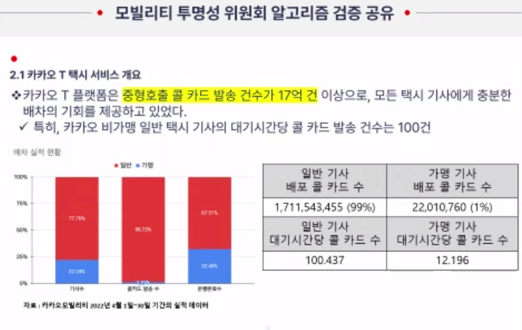 또 김 위원장은 “"일반 기사는 목적지를 확인할 수 있고, 가맹 기사는 확인이 불가하기 때문에 일반 기사의 선택 자유도가 가맹 기사에 비해 높을 수밖에 없다”라며 “이 때문에 오히려 일반 기사 장거리 배차 비중이 높은 것"이라고 부연했다.