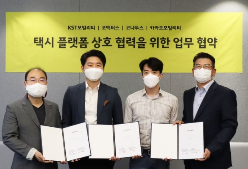 카카오모빌리티는 6일 KST모빌리티, 코나투스, 코액터스와 '택시 플랫폼 상호 협력을 위한 업무 협약'을 체결했다.