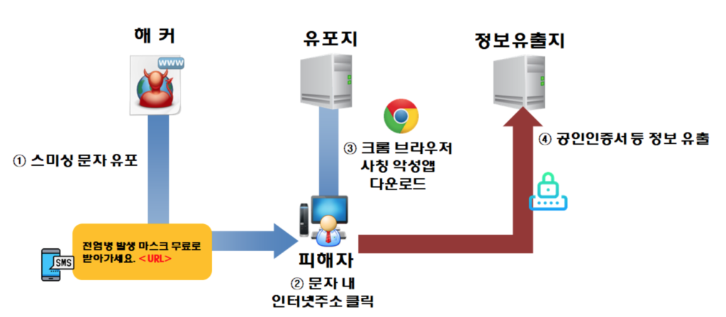 사용자가 코로나19 관련 정보 안내를 사칭한 문자에 포함된 내부 인터넷 주소(URL) 클릭 시, “더 낳은 서비스 체험을 위해 한층 개선된 chrome 최신 버전을 업데이트하시기 바랍니다”라는 팝업이 뜨는데, 이때 무의식적으로 '확인'을 누를 경우 악성 앱이 설치된다.