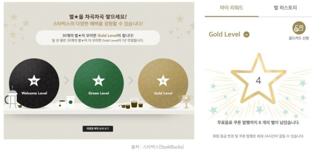 스타벅스의 별 적립 마케팅이 대표입니다. 스타벅스는 시즌별, 나라별, 지역별, 테마별 등 다양한 카드를 발매한다. 마이 스타벅스 리워드는 이용횟수에 따라 ‘별’이 적립되어 혜택으로 돌려주는 리워드 서비스입니다. 적립된 별의 양에 따라 Welcome-Green-Gold 등의 레벨로 회원등급이 상승합니다. 쿠폰에 도장을 찍고 다 채워지면 시즌 한정 상품으로 교환하는 형태는 다른 기업들도 많이 벤치마킹하여 실시하고 있습니다.
