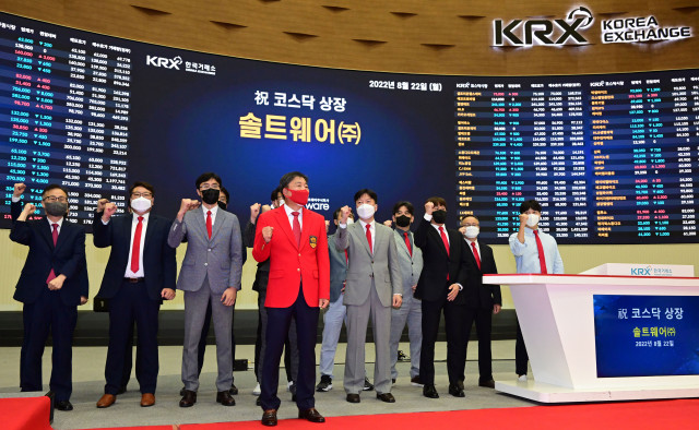 솔트웨어 임직원들이 코스닥 상장을 기념했다 (사진=솔트웨어)