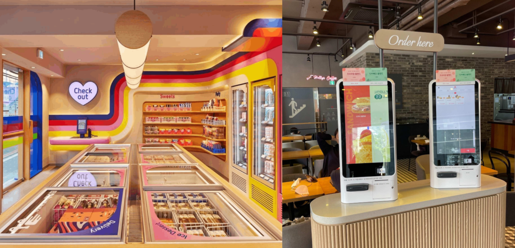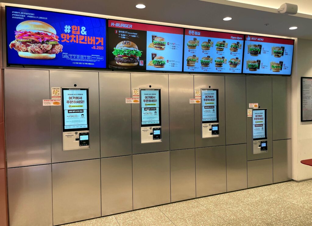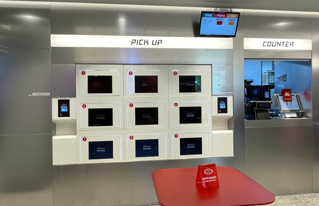주문은 한쪽 벽면의 키오스크 4대가 대신한다. 키오스크에서 결제를 마치면 주문번호와 바코드가 찍힌 영수증이 발급된다. 이후 매장 위쪽에 설치된 스크린에 주문번호가 뜨면 픽업박스에 가서 음식을 수령하면 된다.