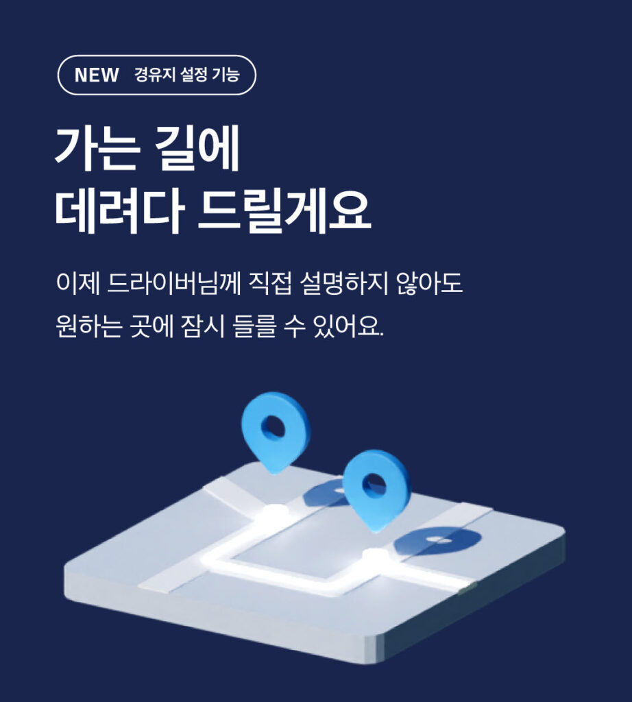타다는 드라이버에게 직접 경유 의사를 설명하지 않아도 원하는 곳에 들렀다 갈 수 있도록 앱 기능을 업데이트했다. 경유지는 최종 목적지와 별개로 최대 2곳까지 설정할 수 있다. 친구나 연인이 함께 탑승해 가는 길에 데려다주고 가는 것은 물론, 목적지로 가는 도중에 동행인들을 태워서 함께 이동하는 것이 모두 가능하다.