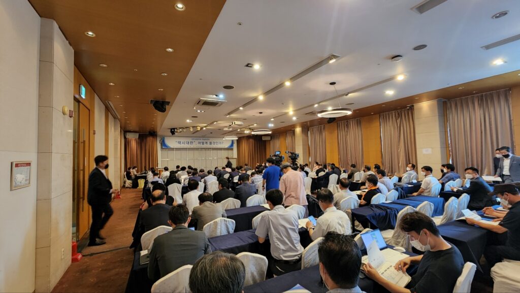 행사장은 시작 전부터 택시 업계 종사자를 비롯해 각계 인사들이 빼곡히 자리를 채우며 높은 관심도를 나타냈다. 특히 개인택시 종사자로 보이는 몇몇 참관객은 “가맹택시 돈 벌어 줄 연구만 하는 거냐” “플랫폼에 가입하지 않은 택시도 많은데 전체 목소리를 들어야 하는 것 아니냐”며 언성을 높여 험악한 분위기가 조성되기도 했다.