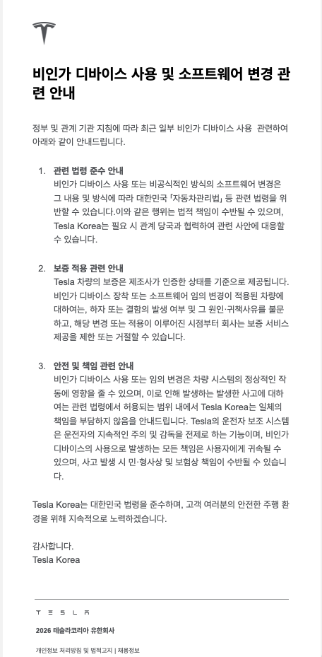 첫째, 비공식 방식의 소프트웨어 변경은 자동차관리법 등 관련 법령 위반에 해당하며 법적 책임을 수반할 수 있다. 둘째, 비인가 디바이스 사용 또는 임의 변경이 적용된 차량에는 결함 발생 여부나 귀책 사유를 불문하고 보증 서비스를 거절할 수 있다. 셋째, 이로 인해 발생하는 사고의 책임은 사용자에게 귀속되며, 민·형사상 및 보험 책임이 수반될 수 있다. 테슬라코리아는 "관련 당국과 협력해 사안에 대응할 수 있다"고도 밝혔다.