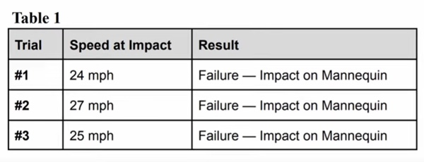 이들의 테스트 결과에 따르면 FSD 베타가 마네킹으로부터 100야드(90m) 이내에 시속 40마일로 활성화됐으며, 세 번의 테스트를 한 결과 항상 시속 24~27마일에서 마네킹을 강타했다.