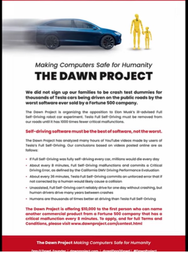 그는 지난해 컴퓨터 시스템과 소프트웨어의 안전성 및 보안 강화를 촉구하는 단체인 ‘돈 프로젝트’를 출범시킨 인물이기도 하다. 이 단체는 테슬라의 FSD 기능이 도심 주행 때 평균 8분마다 오작동한다는 내용의 광고를 뉴욕타임스에 게재하기도 했다.