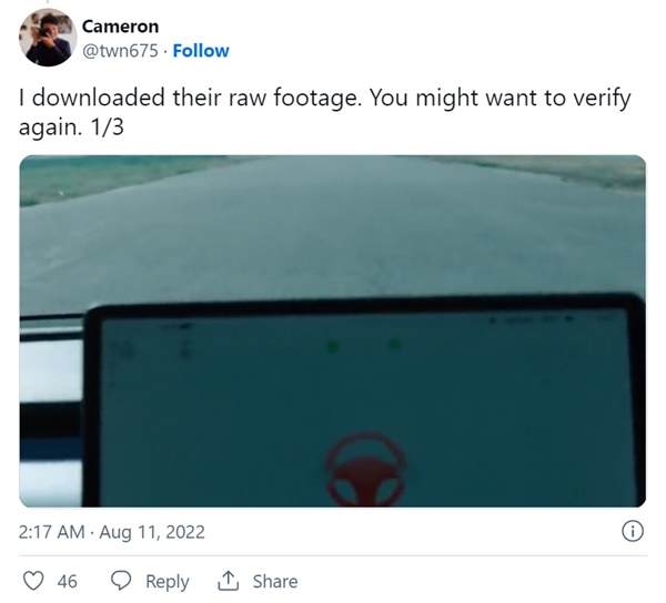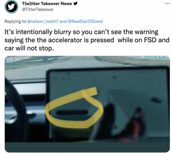 영상을 분석한 자동차 전문매체 일렉트렉과 트위터러, 테라볼트테크 유튜브TV 등은 동영상 속 테슬라 테스트 차량의 완전자율주행(Full Self Driving·FSD) 베타 SW가 실행되지 않은 채 테스트가 이뤄졌다며 의문점과 문제점을 지적했다.