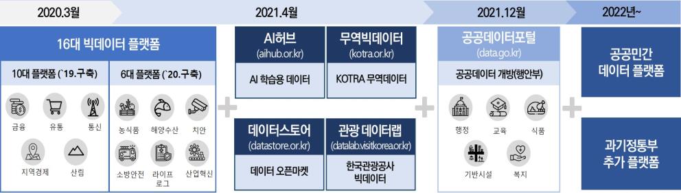 과기정통부는 2019년부터 분야별 데이터의 수집‧가공‧분석‧유통을 위한 빅데이터 플랫폼을 구축‧운영하고 있으며, 2020년 3월에는 통합 데이터지도 서비스를 개시하여 빅데이터 플랫폼의 통합적인 검색‧활용을 지원하고 있다.