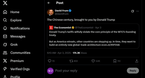 애틀랜틱의 기자이자 조지 W. 부시 전 대통령의 연설문 작성자였던 데이비드 프럼은 4월 2일 소셜 미디어 게시물을 통해 “도널드 트럼프가 선사하는 중국의 세기(The Chinese century, brought to you by Donald Trump)”라고 말했다.
