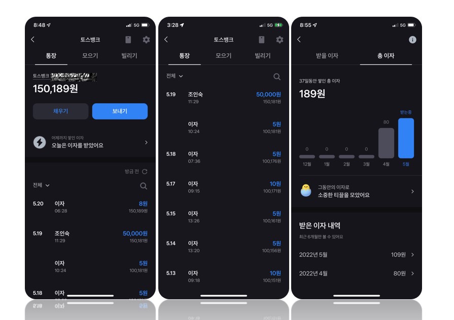 토스뱅크 통장을 개설하고 우선 10만원을 넣었다. 이자는 5원. 이렇게 매일 5원씩 이자가 쌓여갔다. 복리 효과를 위해 출근길에 매일 ‘지금 이자 받기’ 버튼을 열심히 눌렀다. 토스뱅크를 시작한 4월 13일부터 한 달이 조금 넘은 5월 19일, 이자는 181원이 됐다. 10만원에서 금액이 더 늘어나면 이자는 얼마가 될까? 그래서 5만원을 더 추가했다. 금액을 추가하자 오늘 받을 이자는 8원이 됐다.