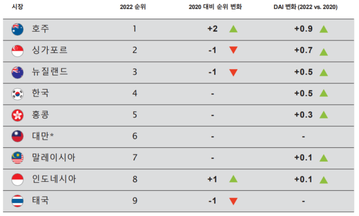그 뒤를 이어 2년 전 1~2위를 기록했던 싱가포르와 뉴질랜드의 기업들이 0.5 ~ 0.7포인트 DAI가 개선되면서 각각 2, 3위를 차지했다. 한국 기업들은 2020년보다 DAI가 0.5포인트 개선되면서 2년 전과 동일한 4위를 유지했다. 하지만 이 지사장에 따르면 문제는 선도기업이 아닌 팔로워 기업들이다.